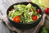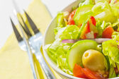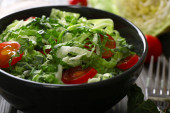Płyta z świeże sałatki na stół szary