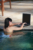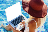 Zdjęcie "kobieta w basenie z laptopa" może być wykorzystywane do celów osobistych i komercyjnych zgodnie z warunkami zakupionej licencji Royalty-free. Obraz jest dostępny do pobrania w jakości wysokiej rozdzielczości do 5760x3840.