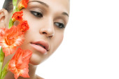 Piękna kobieta z makijażem na twarzy i kwiatów tła. Pojęcie piękna.
