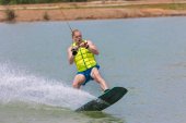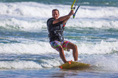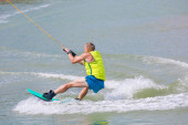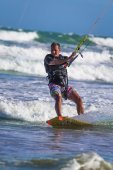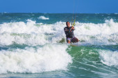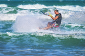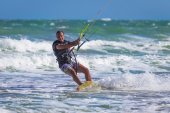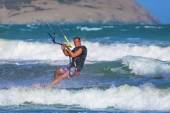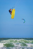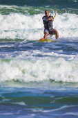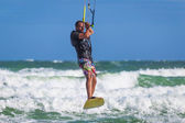 Lekkoatletycznego mężczyzna jazda na kite deski surfingowej w fale morza