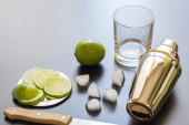 Iced tea w plastikowy kubek ze słomką z plastrem limonki. Biały w