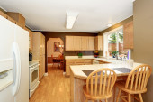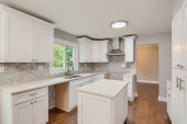 Zdjęcie "Biała kuchnia pokój wnętrze z marmuru licznik top i drewniane podłogi. " może być wykorzystywane do celów osobistych i komercyjnych zgodnie z warunkami zakupionej licencji Royalty-free. Obraz jest dostępny do pobrania w jakości wysokiej rozdzielczości do 5760x3840.