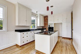 Biała kuchnia pokój wnętrze z marmuru licznik top i drewniane podłogi.
