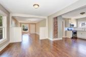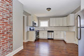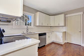 Biała kuchnia pokój wnętrze z marmuru licznik top i drewniane podłogi.