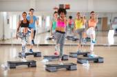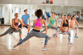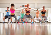 Trener żeńskiej prowadzić Grupa treningu w centrum fitness