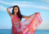 Zdjęcie modelu brunetka pozowanie na plaży szwedzki