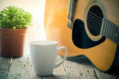 Filiżanka kawy i gitara akustyczna następnego okna z kropli wody, czarno-białe