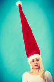 Zadowolony ładny kobieta w santa pomocnik kapelusz. Boże Narodzenie.
