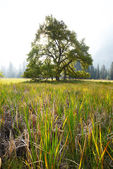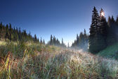 Leśne zbocze górskie w nisko położonej chmurze z wiecznie zielonymi iglastymi iglastwami osłoniętymi mgłą w malowniczym krajobrazie