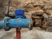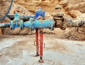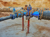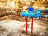 Detal, armatura, zasuwy 250mm i 150mm, redukcja wspólnych członków w systemie wody pić.