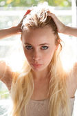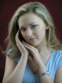 Portret (close-up) z pięknym białym uśmiechnięte dziewczyny z pogan rzut oka w studio.