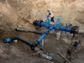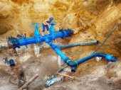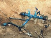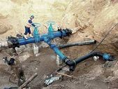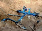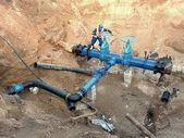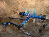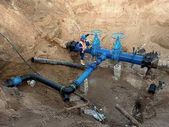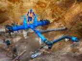 Ekspert techniczny pod ziemią w zaworze bramy na 500mm rury wody pitnej. Sprawdzić naprawione rurociągi przed pokryciem gliną. Izolacja asfaltu