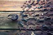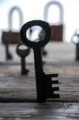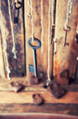 Klucze, wiszące na sznurku. Tle dymu. Selektywny fokus