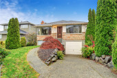 Zdjęcie "Amerykańska Dom na zewnątrz z trzema garażem i dobrze utrzymanym ogrodem" może być wykorzystywane do celów osobistych i komercyjnych zgodnie z warunkami zakupionej licencji Royalty-free. Obraz jest dostępny do pobrania w jakości wysokiej rozdzielczości do 5760x3840.