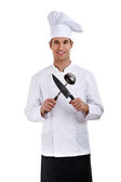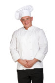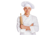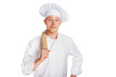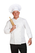 Szef kuchni w mundurze z wałkiem na białym tle nad białym.