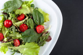 Sałatka z zielonej i fioletowej sałaty, pomidorów i ogórków na białym tle z góry widok.