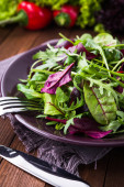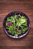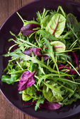 Świeża sałatka z mieszanymi zielonymi (arugula, MESCLUN, mache) na ciemnym drewnianym tle widok z góry.