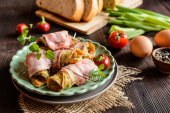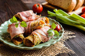 Pieczarki nadziewane serem, słońce suszonych pomidorów i zawijane w boczku