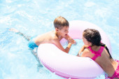 Szczęśliwe dzieci bawią się w błękitnej wodzie basenu.