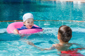 Zdjęcie "Szczęśliwe dzieci bawią się w błękitnej wodzie basenu." może być wykorzystywane do celów osobistych i komercyjnych zgodnie z warunkami zakupionej licencji Royalty-free. Obraz jest dostępny do pobrania w jakości wysokiej rozdzielczości do 5760x3840.