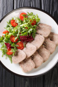 Ciepła Sałatka z grilla wołowiny z rukolą i pomidorami bliska. h