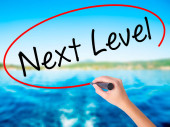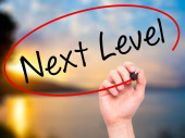 Zdjęcie "Ręką człowieka pisania następnego poziomu z czarnego markera na wizualne ekranie" może być wykorzystywane do celów osobistych i komercyjnych zgodnie z warunkami zakupionej licencji Royalty-free. Obraz jest dostępny do pobrania w jakości wysokiej rozdzielczości do 5760x3840.