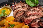 Zdjęcie "Rumsztyk, Rumpsteak wołowiny z marmuru wołowiny średnio rzadki z ziemniakami " może być wykorzystywane do celów osobistych i komercyjnych zgodnie z warunkami zakupionej licencji Royalty-free. Obraz jest dostępny do pobrania w jakości wysokiej rozdzielczości do 5760x3840.