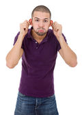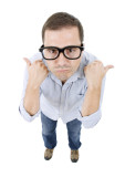 Geek głupi człowiek pełnej długości wygranej, na białym tle