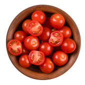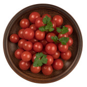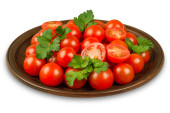 dojrzałe pomidory w wiklinowym koszu na białym tle