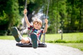Małe dziecko chłopca kołysanie na plac zabaw na zewnątrz