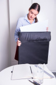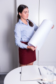 Młoda kobieta professional jest praca z jej okulary w jej han