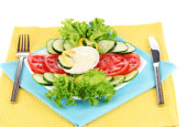 pokrojone warzywa i sosem na talerzu na drewnianym stole