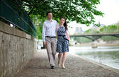 Para spacerująca w Paryżu, w pobliżu kawiarnia na świeżym powietrzu