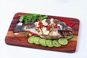 Zdjęcie "Ryba Tilapia strumieniowo z cytryny na szczycie ostro kwaśny imbir i chili na rzeźnika serwowane. (Wywołanie Pla Nil Nuang Manoaw w Tajlandii) na białym tle." może być wykorzystywane do celów osobistych i komercyjnych zgodnie z warunkami zakupionej licencji Royalty-free. Obraz jest dostępny do pobrania w jakości wysokiej rozdzielczości do 5760x3840.