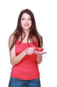 atrakcyjny dziewczynka uśmiechający się w żółta koszulka, kubek i sauc