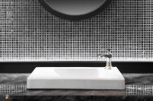 Zdjęcie "Wnętrze łazienki z zlewem i baterią" może być wykorzystywane do celów osobistych i komercyjnych zgodnie z warunkami zakupionej licencji Royalty-free. Obraz jest dostępny do pobrania w jakości wysokiej rozdzielczości do 5760x3840.