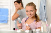 kobieta czyszczenie twarzy z bawełny podkładka łazienka