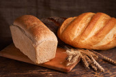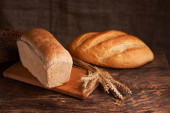 Kromki chleba na pokładzie cięcia i kłosy pszenicy na drewno