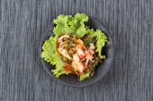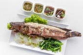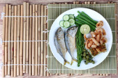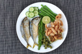 Zdjęcie "Tajskie jedzenie, głęboko opalanych strumieniowo - mackarel i pikantne zioło mieszane z kalmarów smażone. " może być wykorzystywane do celów osobistych i komercyjnych zgodnie z warunkami zakupionej licencji Royalty-free. Obraz jest dostępny do pobrania w jakości wysokiej rozdzielczości do 5760x3840.