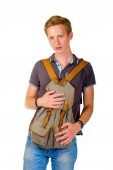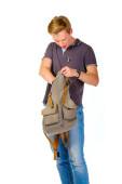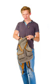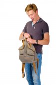 Młody człowiek szuka czegoś wewnątrz jego plecak