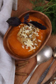 Zupa krem z dyni z grzankami ceramiczne miski na b biały