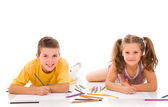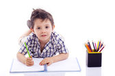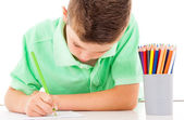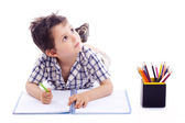pięknego chłopca, rysowanie kredkami kolorowy na białym tle ove