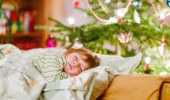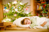 ładny blond chłopiec śpi pod choinkę