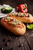 Grzanki smażone z mięso z kurczaka, pomidory, chili, papryka, fasola i kukurydza