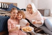 Rozbawiony dziewczyna jedzenia berry babeczki z dziadkami