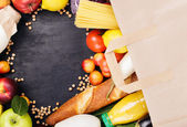 Papierowa torba pełna różnych artykułów spożywczych na drewnianym stole