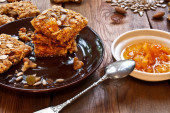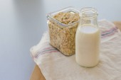Owies przekąski, szklanka mleka na niebieskim drewnianym stole