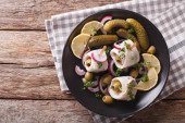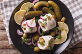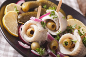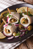 rolki śledzie marynowane oliwki, cebula, ogórki i lemo