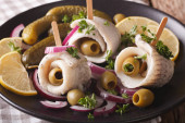 Rolmopsy śledzie z oliwkami, cebulą i ogórki z bliska. Verti