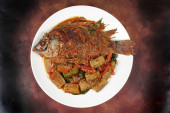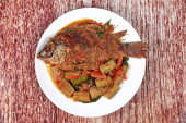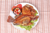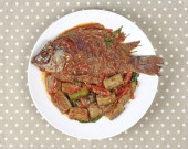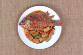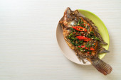 Ryby smażone tilapia zwieńczona pikantny bakłażan smażony.